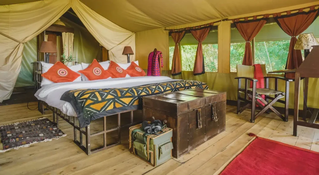 The camp consists of 15 tents, including three luxurious tents. Each tent has its own veranda and en-suite bathroom. All tents, Deluxe and Classic, benefit from a fabulous view over the Mara plain and Mara River. Double or twin rooms are available and two of the Classic tents are adjacent and share the same path way. They are ideal for families with children in their own tent. Lighting is solar-powered, the tent floors are wooden and the bathrooms are fitted with flush toilets and a safari shower with hot water.